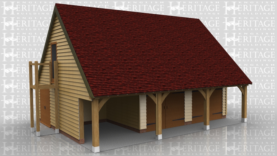 This oak framed two storey garage has three enclosed bays, one with a setback partition. The other bays are accessed by two sets of garage doors and there is an external oak staircase to the left. There is a single door to the right hand side and a single pane window on the first floor.