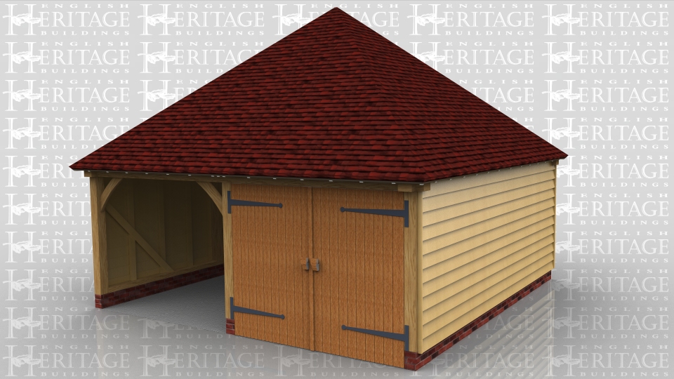 A 2 bay garage with one side secured with a partition and garage doors. It has a fully hipped roof which meets at a point.