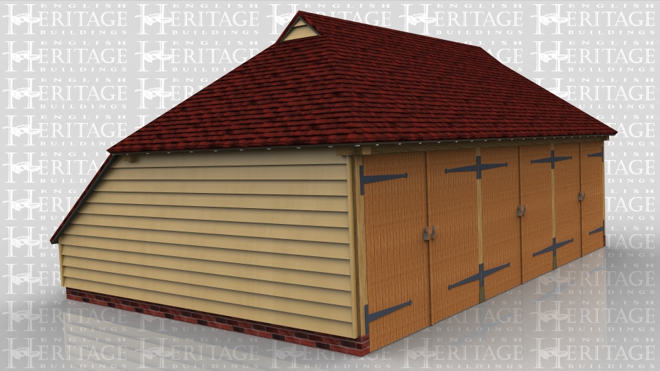 This is a three bay oak framed garage secured with three pairs of traditional side hung garage doors. The roof has a gablet each end finished with weatherboard and a catslide roof to the rear to keep the ridge height under 4m.