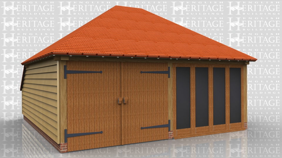This two bay oak framed garage building combines a single garage bay secured with garage doors at the front and a single bay garden room / summerhouse which has a glazed unit at the front with the centre two panes opening as doors. The roof is fully hipped and has a rear catslide to keep the ridge height down whilst giving more internal floor area.