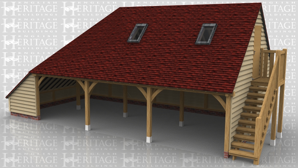This oak framed three bay open fronted garage has a first floor accessed via an external oak staircase on the right hand side. The roof has two rooflights and has a full hip and catslide on the left hand side.