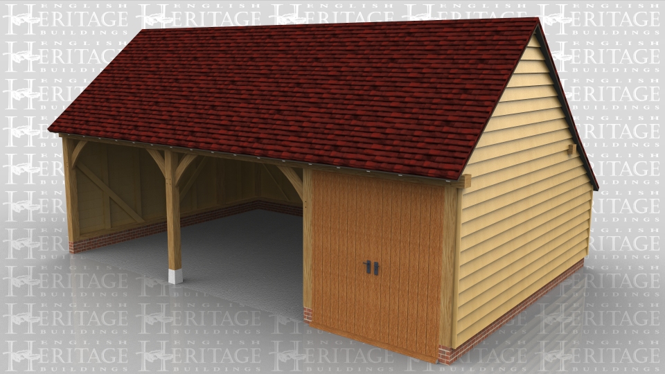 This oak framed garage building is formed of three bays, one enclosed and two open. The enclosed bay is accessed via a set of garage doors to the front and has an enclosed store to the rear.