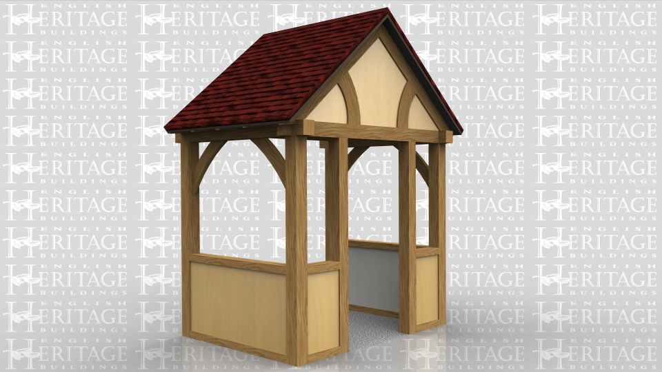 This is a porch to go over an entrance door. The green oak frame has render infill panels on the lower sections and the gable.