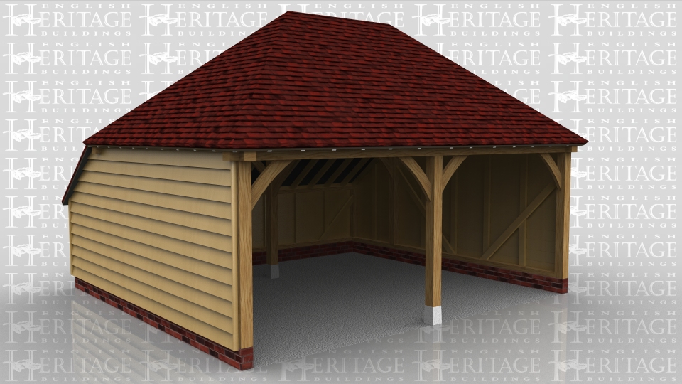 This is an open fronted two bay garage with hipped ends and a rear catslide to keep the ridge height to below 4m and maximise the internal floor area.