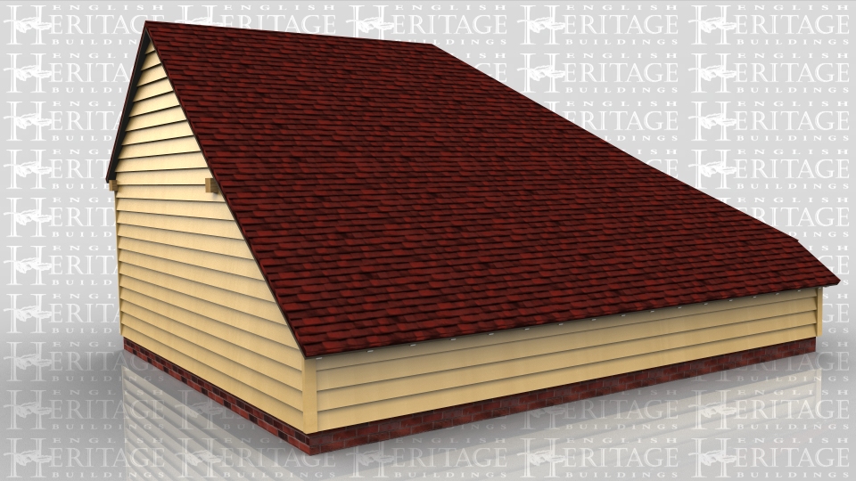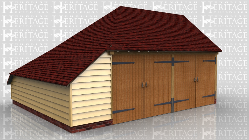 This two bay garage is enclosed with 2 pairs of traditional side hung garage doors on the front. It has a catslide roof on the rear and left hand side.