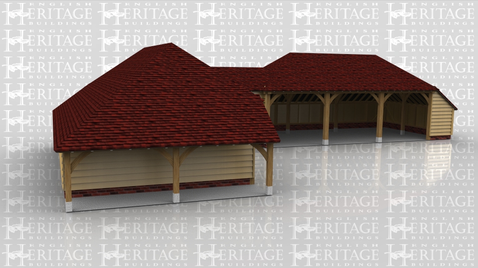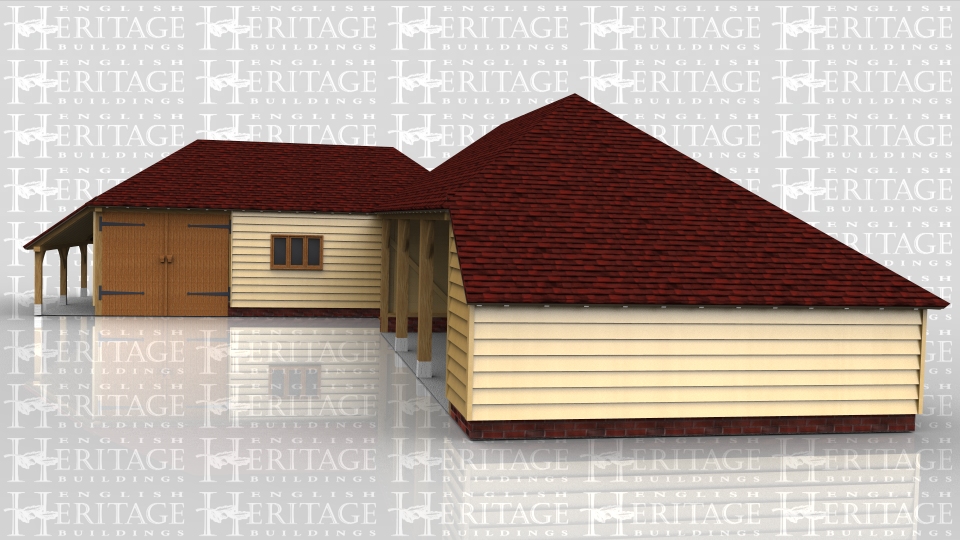 This oak framed complex is formed of three frames; the first is a three bay garage with an open logstore to the left side. It is accessed by a single set of garage doors to the front and also has a three pane window. The second frame is a single bay store/workshop that functions as a link between the two frames. It is accessed via a single door to the front and has a mullion window. The third bay is a three bay open garage with an enclosed store to the right side and to the rear.