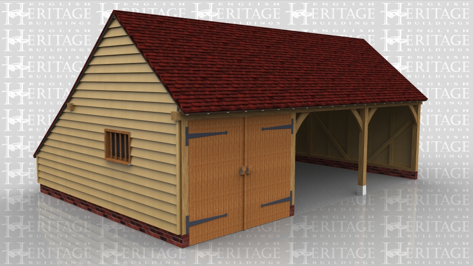 This 3 bay garage has gable ends and a rear catslide that keeps the ridge below 4m whilst maximising the internal floor area. It has 2 open fronted bays and one bay secured with a partition and a pair of garage doors. There is also a mullion window in the left hand wall.