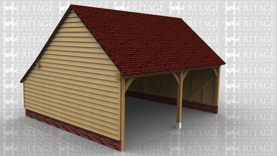 This is a two bay open fronted garage with gable ends and a catslide roof at the rear.