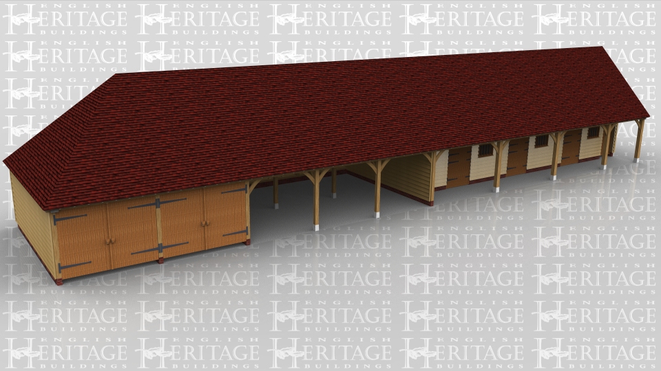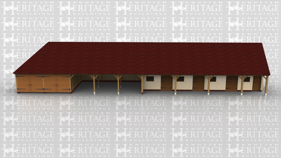 This 9 bay building has 2 seperate garages, both with garage doors to the front, 3 open bays used as a hay barn, then 3 stables and finally a feed store / tack room on the end. Each stable has a stable door and mullion window and the tack room has a mullion window and a solid single door. The fronts of the stables are set back so there is a walk way along the front.
