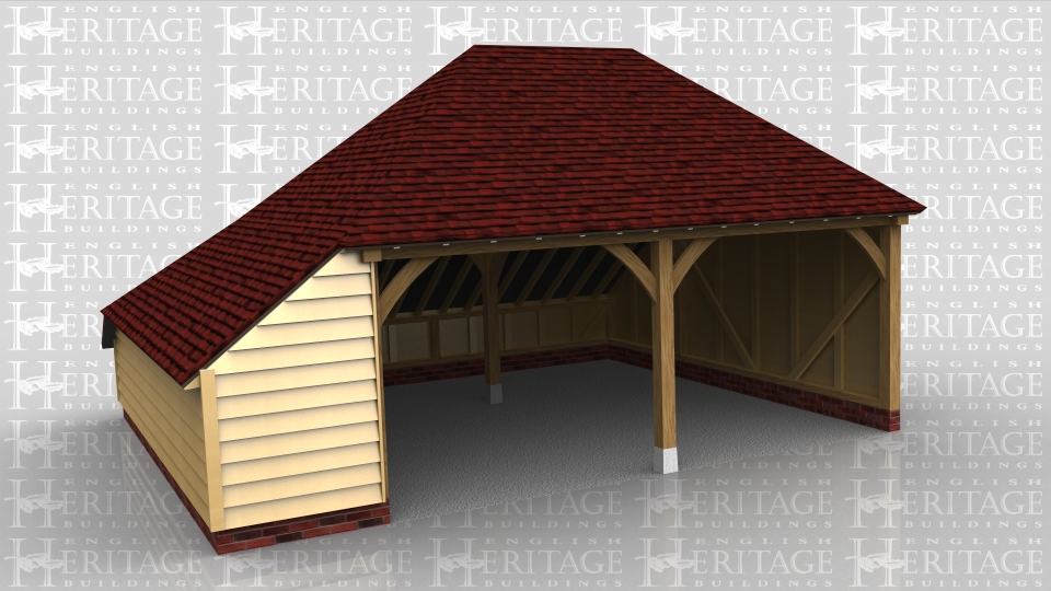 This is a 2 bay open fronted garage with an store on the left hand side. The roof is double hipped and there is a rear catslide to keep the ridge height below 4m and still maximise the internal floor area.