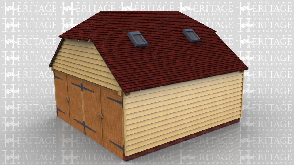This building is a 2 bay garage secured with two pairs of traditional side hung garage doors. The roof has barn hip ends and 2 Velux rooflights.