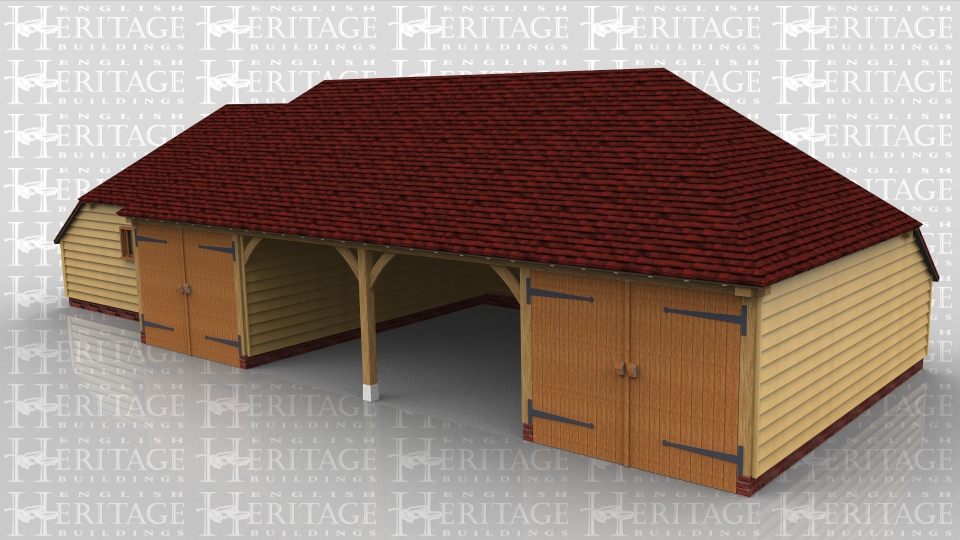 This oak framed complex is formed of two frames. The main building is a four bay garage and has one bay on the right enclosed with a partition and garage doors. The centre 2 bays are open fronted garage bays and the left hand bay has a partition and garage doors. The second building is used as a workshop and storage area. This workshop is accessed through the left hand garage and has one mullion window in the front partition wall.