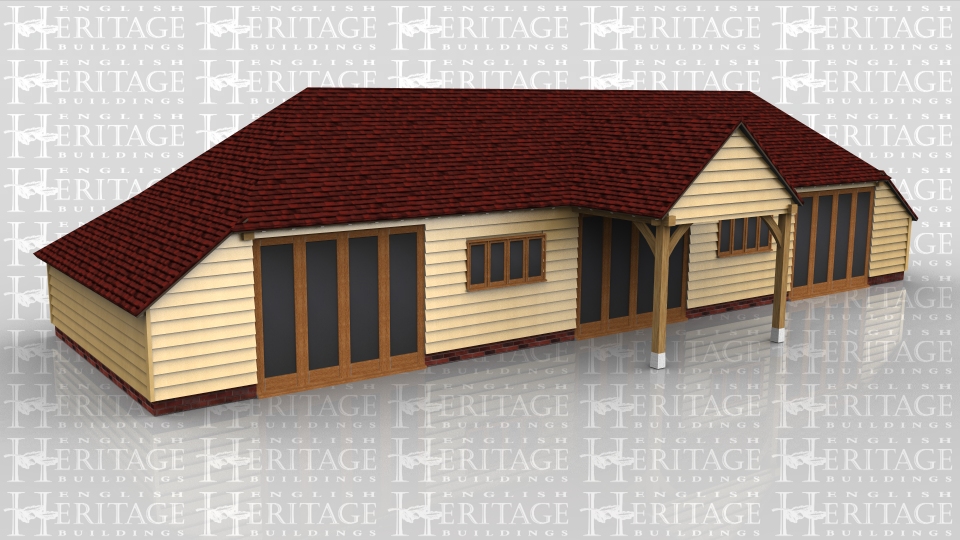 This building is a large summerhouse/garden room/playroom. It has five bays with an enclosed store to both ends and the rear. It also has a double barn entrance on the front to act as a covered porch area. There are three sets of fully glazed opening doors and two four light casement windows in the front elevation. The rafters are in oak, including four feature trusses, and the roof is insulated to a warm roof specification.