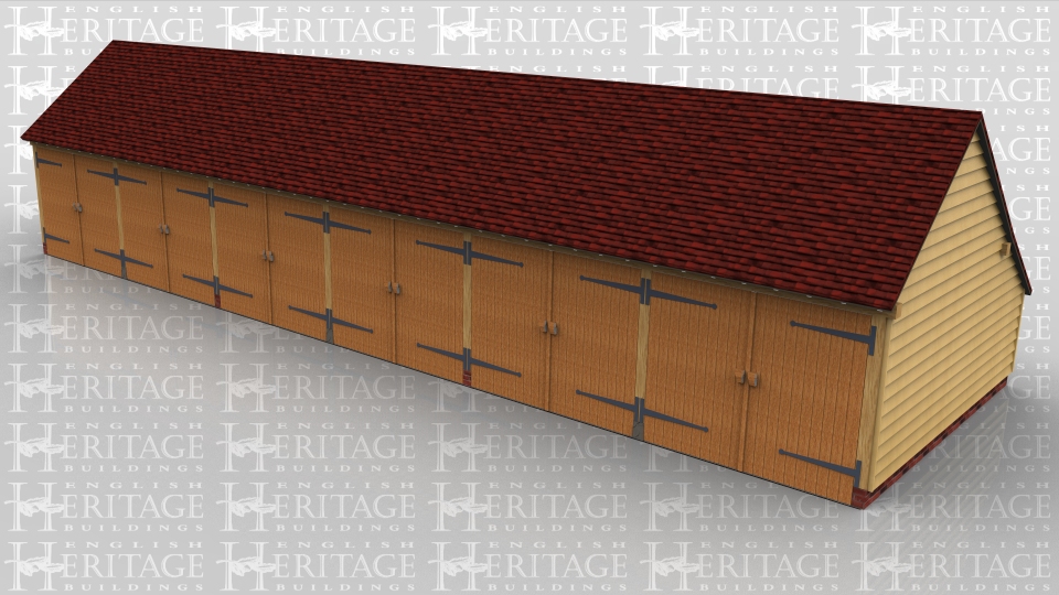 This oak framed six bay garage block is for the use of three different properties and they each have two garages each. The building has gable ends and a rear catslide to keep the ridge below 4m but still give a usable depth of garage inside. Each garage is secured at the front with a pair of traditional side hung garage doors.