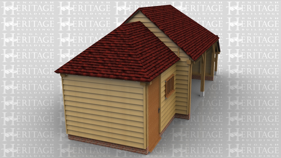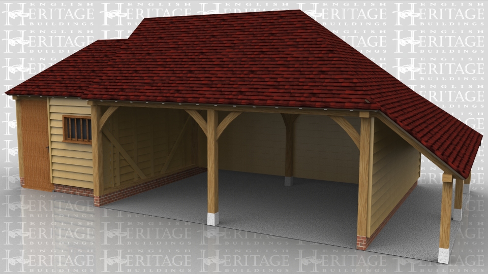 This oak framed garage building has a small workshop/store connected to a two bay open fronted garage with a logstore on the right hand side. The store is accessed by a solid single door and there is also a mullion window.