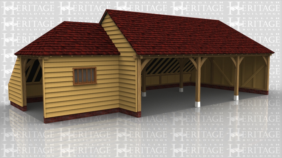 This building is a 3 bay open fronted garage with a log store on the right hand side. On the left side is a single bay which is open on the end and has a mullion window on the front.