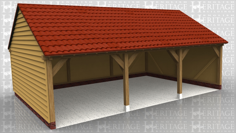 This is a full span open fronted 3 bay garage with gable ends. It has a low pitch and a pantile roof.