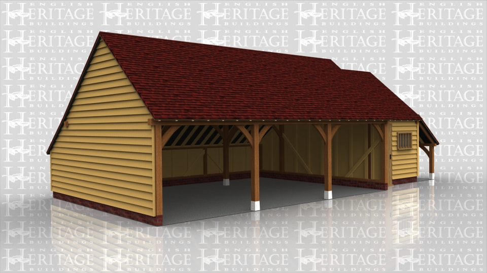 This is a 3 bay open fronted garage with gable ends with a single bay store on the side. The store also has a gable end and a catslide log store on the side. The store is accessed through a solid single door and also has a mullion window.