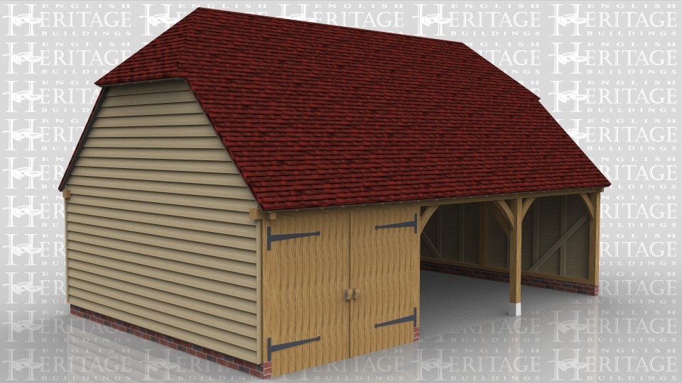 This is an oak framed 3 bay garage with first floor. There are 2 open fronted bays and one secured at the front with garage doors. Access to the first floor is through a hatch in this secure bay and this area is just for storage.