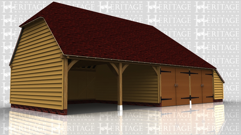 This is a full depth oak framed garage with a barn hip on the left and a full hip and catslide on the right hand end. Two bays are partitioned off and secured with 2 pairs of garage doors and the other 2 bays are open fronted.
