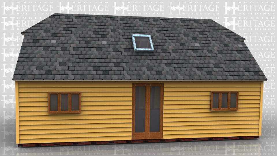 This building is a small oak frame annex that provides one bedroom, one bathroom, lounge and small kitchenette. There is a single enclosed barn entrance on the front to form a small porch area with a half glazed front door. At the rear there is a set of glazed french doors which would lead out into the garden. There are four three pane casement windows and one one rooflight to give natural light into the building.