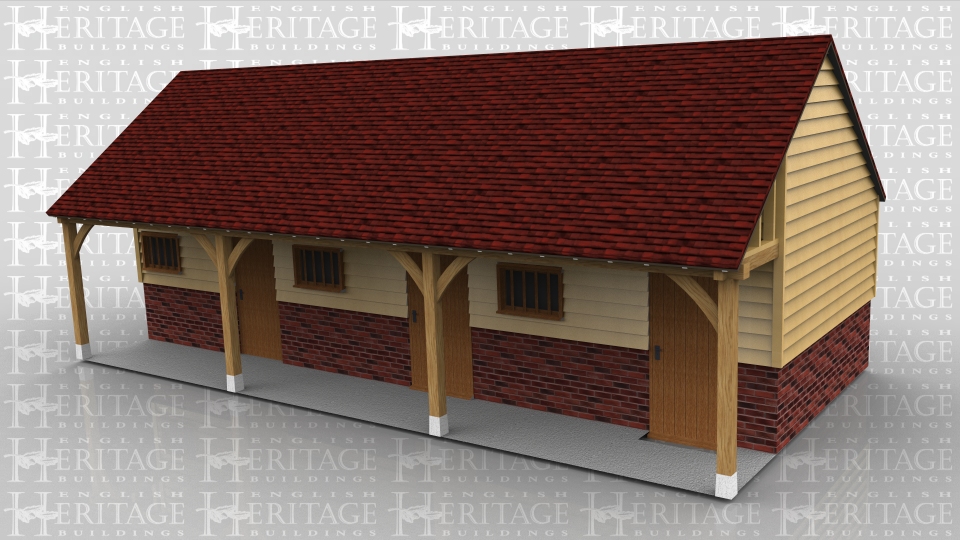 This three bay oak framed building has a set back front and is sitting on a high plinth wall. Each bay is seperated by partitions and has a decorative stable door and mullion window in the front. The centre bay also has a solid single door in the rear. Although this was made to look like a stable it is in fact three small workshop areas.