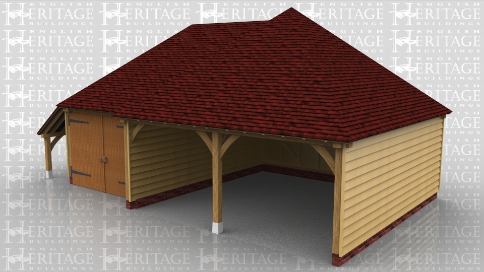 This building is a two bay oak framed open fronted garage with hipped ends with a single bay garage garage with log store on the left hand side. The single garage has garage doors on the front.