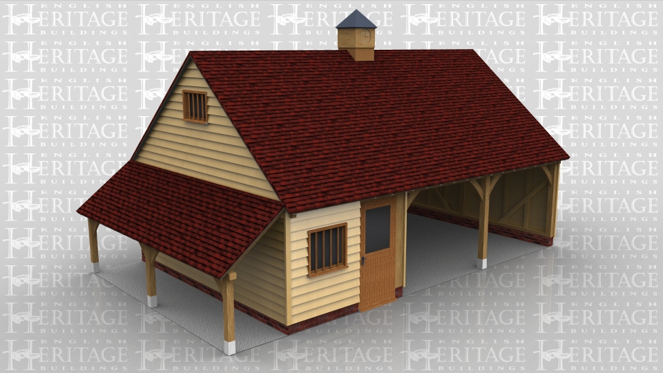 This oak framed garage building has a rear wall in full height brickwork.There are two open fronted parking bays and the third bay is enclosed with partitions and has a half glazed single door and mullion window in the front elevation. There are also mullion windows in both gables and a clock tower in the centre of the roof. There is a catslide roof on the left hand end making an open log store.