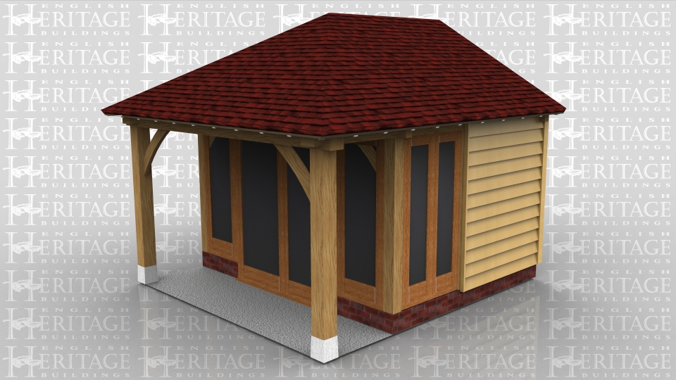 This oak frame is used as a small summerhouse / garden room. The fully glazed unit on the front is set back so there is a small veranda. Part of the side walls are glazed and the rest along with the rear are clad in weatherboard.