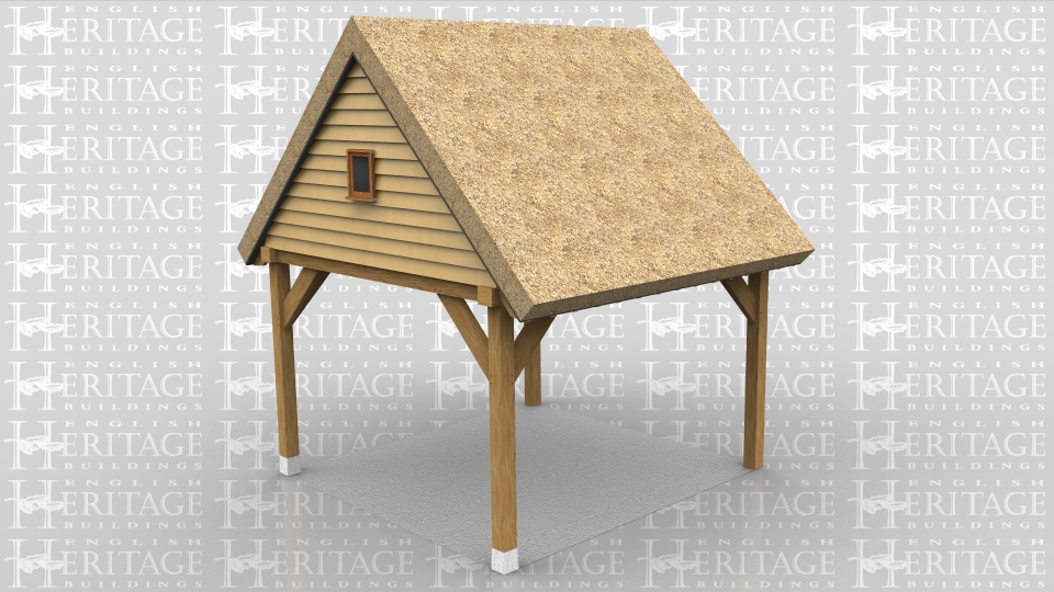 This oak frame is an open carport attached to an existing building on one side. The roof has a gable end and the roof covering is thatch. The gable is weatherboarded and has a small window in it.
