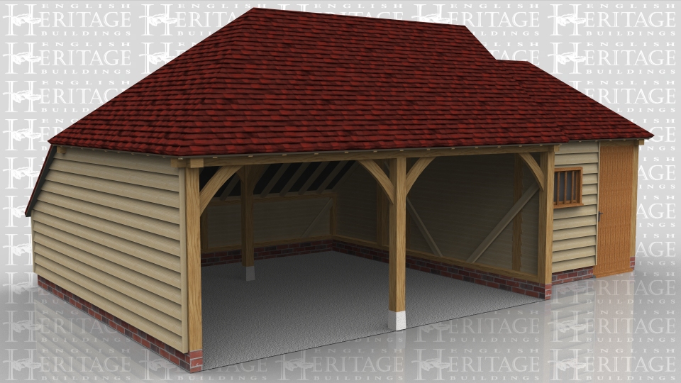 This building is a two bay open fronted oak framed garage with rear logstore. Attached to the side is a small store/workshop with a solid single door and mullion window.