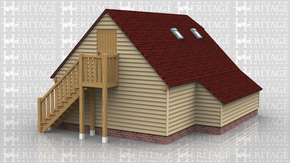 This is a three bay open fronted oak framed garage with rear catslide along two of the bays. The external oak staircase leads up to a solid single door to access the first floor. There are two rooflights to get some natural light into the upstairs space.