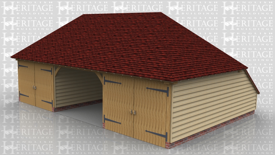 This three bay oak framed garage has hipped ends and an enclosed rear logstore. The bays are wider than normal to give that little bit of extra room as the outside two bays are enclosed with partitions and garage doors leaving the centre bay open at the front.