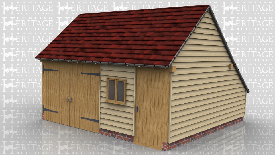 This two bay oak framed building has gable ends and an enclosed logstore to the rear. The left hand bay has a pair of garage doors on the front and the right hand bay has a partition with a solid single door and two pane casement window at the front.