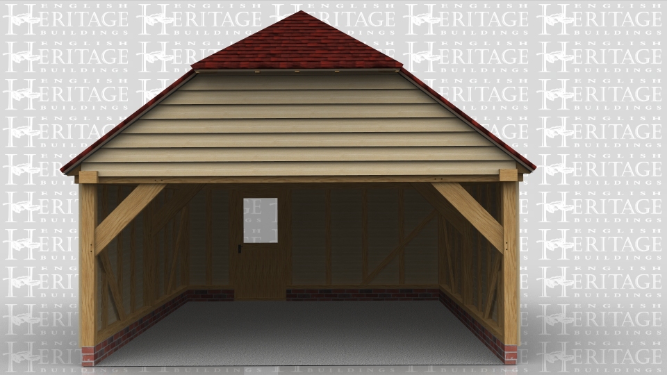 This oak framed building is a wide garage with two enclosed bays. Access is via an open left side and a single half glazed door on the right side.