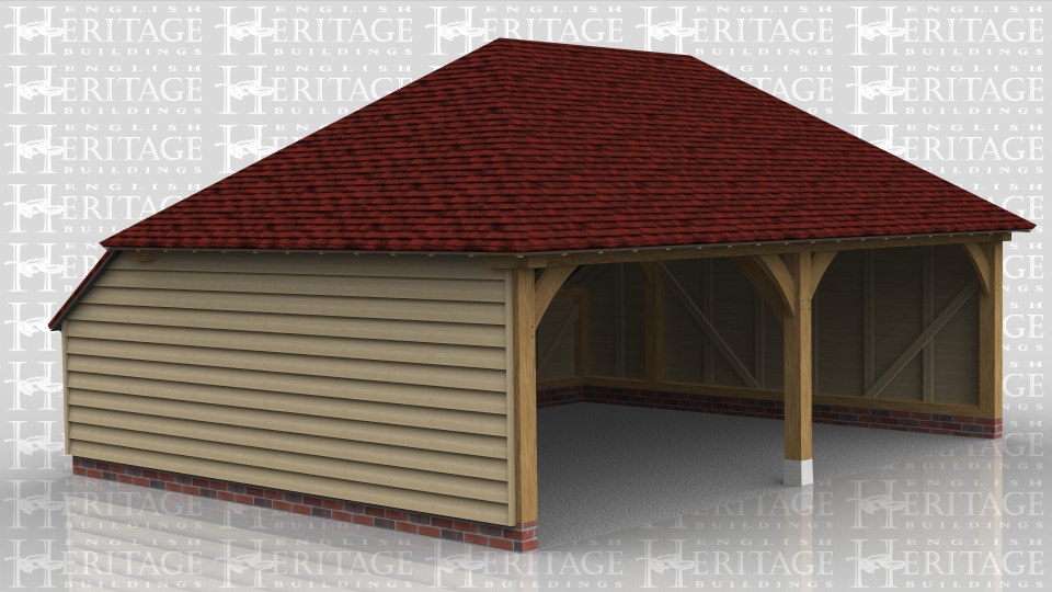 This oak framed two bay garage has extra wide bays, hipped roof ends and an enclosed store to the rear.