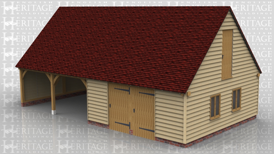 This oak framed building has two open fronted garage bays and two bays partitioned off to form two workshop areas. Each of these workshops has a wide solid door front and rear and the end one has two pane casement windows. The first floor is used for storage and is accessed via a hatch. The building has gable ends and a hay barn style single solid door in the first floor right gable and a small store building on the left hand side.