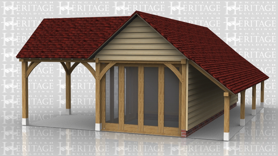 This oak frame building is formed of two frames. There is a single garage with garage doors on the front and mullion window in the side. There is a garden room/summerhouse with full height glazing on two sides and a covered outside sitting area. There is also an open log store on the left side.
