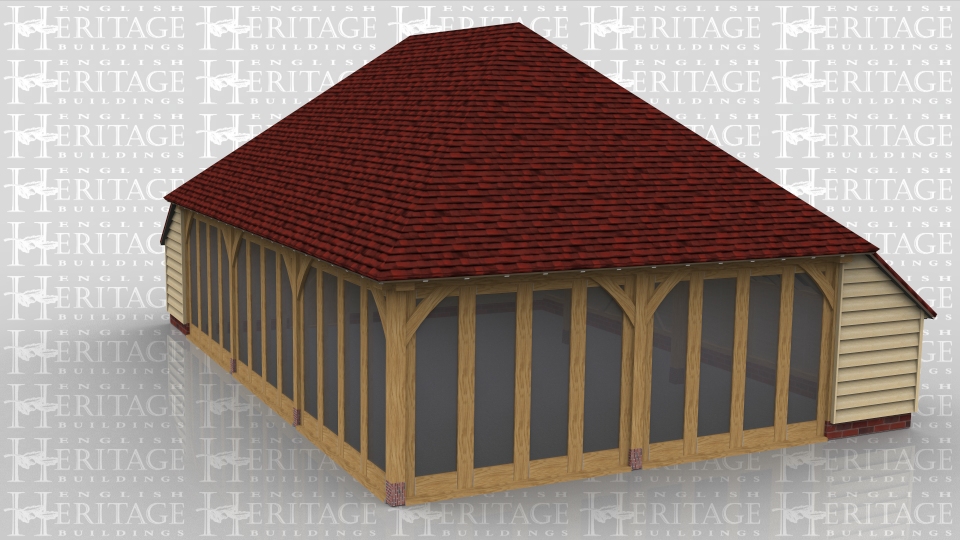 This oak framed leisure building has hipped roof ends, enclosed store to the rear and one side and a projecting double barn entrance on the end to provide a mower and garden machinery store. The main three bays are fully glazed on two sides and part of the catslide is used as a toilet.