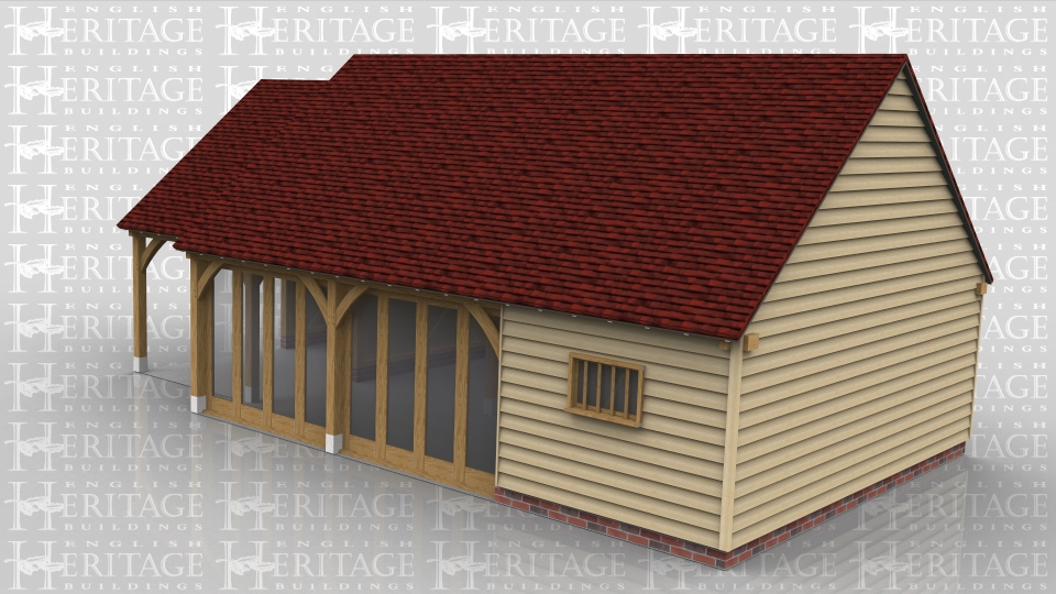 This oak framed home leisure building is comprised of two frames; one is an open garage bay which is attached on the right side to a large three bay garden room with full length glazing to two of the front bays. The third bay is enclosed by partitions and is a store or workshop, with a mullion window to the front and access via a single door on the left.