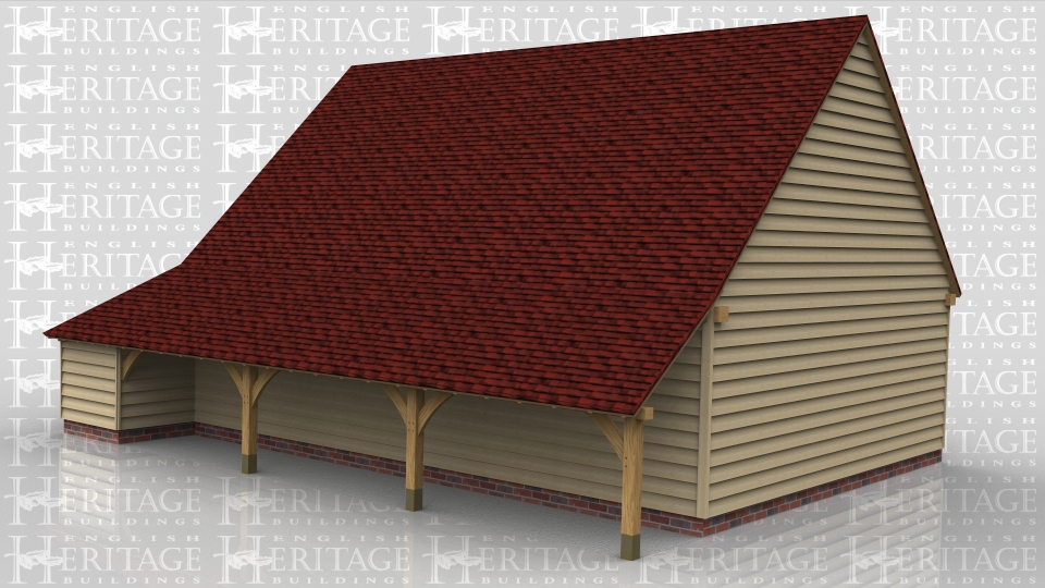 Three bay oak framed garage with one enclosed bay with garage doors, and two open bays. Enclosed logstore to the side and an open logstore to the rear.