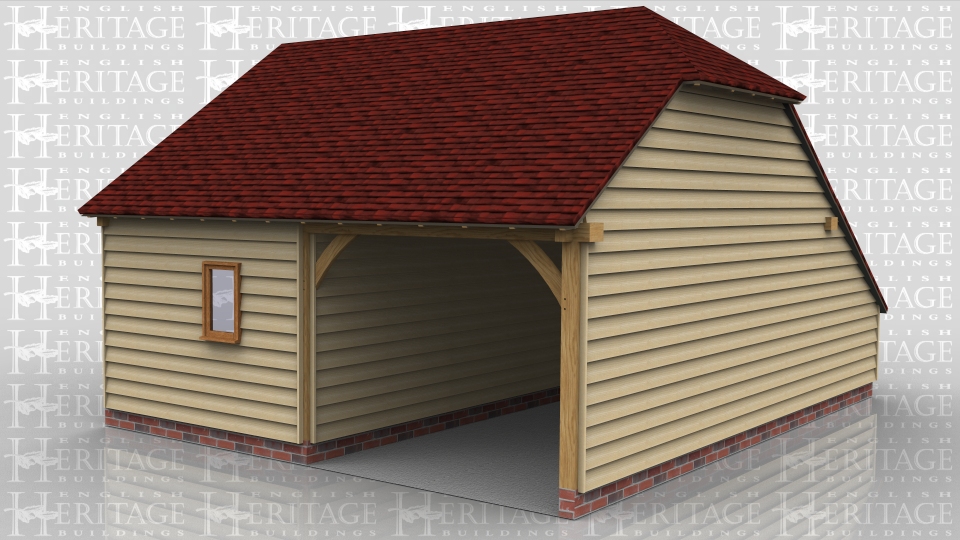 This oak framed garage complex has an enclosed storage room or workshop, a two bay open garage, and an enclosed single bay garage to the rear. The store room is accessed by two solid single doors and it has a single pane window to the front.