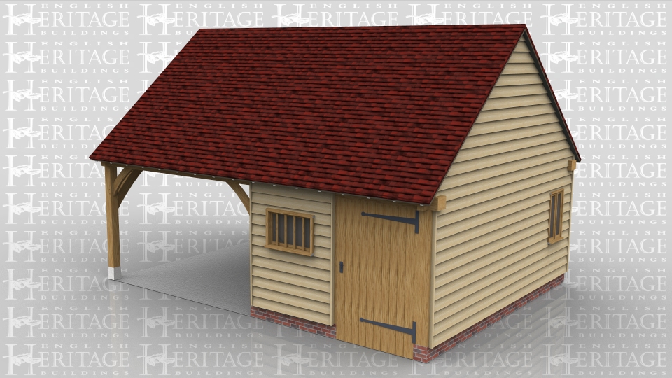 This oak framed garage has two bays, with one enclosed and one open. The enclosed bay is accessed by a single door at the front and a single door at the side. The enclosed bay has a two pane window and a mullion window at the front. The first floor storage area is accessed via a hatch in the building.