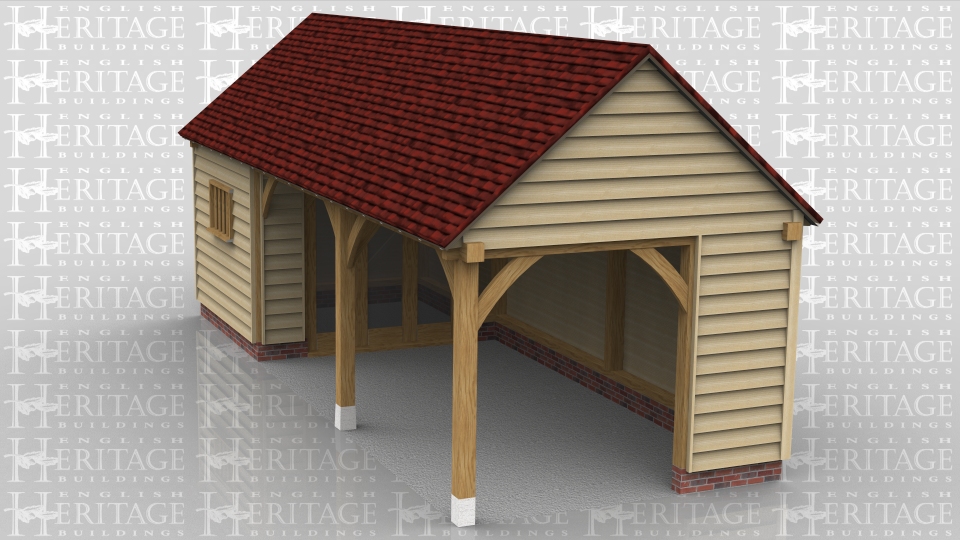This is an oak framed building with three bays on the left hand side there is two sets of fully glazed units. Two of the bays are open and the other bay is enclosed which can be accessed by the wide door at the rear of the building.