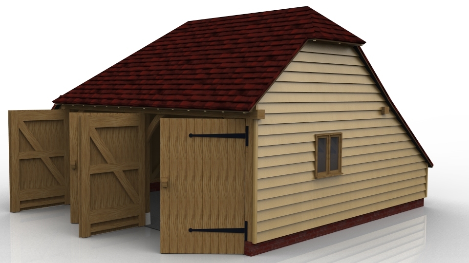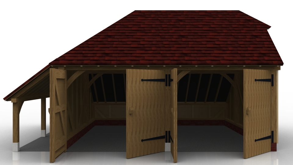 This oak framed two bay garage has enclosed bays with garage doors on the front, and an open logstore to the side. The right bay also has a two pane window.
