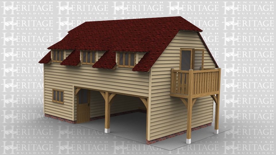 This oak framed two storey home leisure building is formed of a sling brace frame in order to give a higher ridge height. There are three bays, one enclosed and two open, with the enclosed bay accessed via a single half glazed door to the right and a three pane window to the front. On the first floor there are three dormers to the front, each with a three pane window. To the right side there is a small balcony, accessed via a set of full length garden room windows.