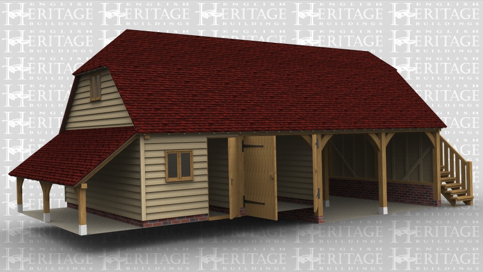 This oak framed two storey four bay garage has two open bays and two enclosed bays. The two enclosed bays are accessed via a single door and a pair of garage doors. There is a two pane window to the front of the building and also to the left side. The first floor is accessed by an external oak staircase and a solid single door. To the left of the building there is an open logstore.