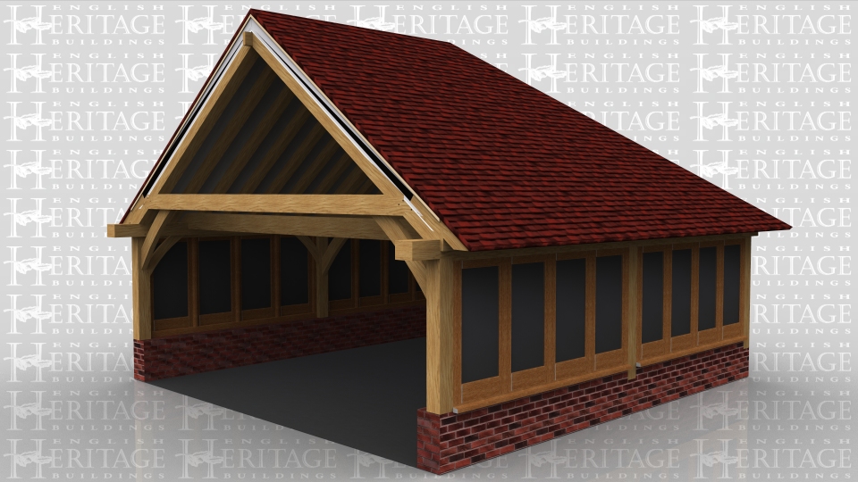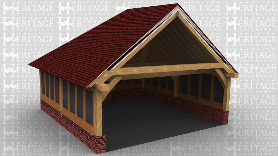 This oak framed three bay oak framed garden room extension to a house is sitting on a dwarf cavity brick wall apart from the fully glazed doors. Full glazing on all three sides.