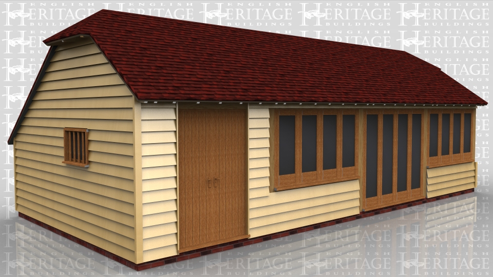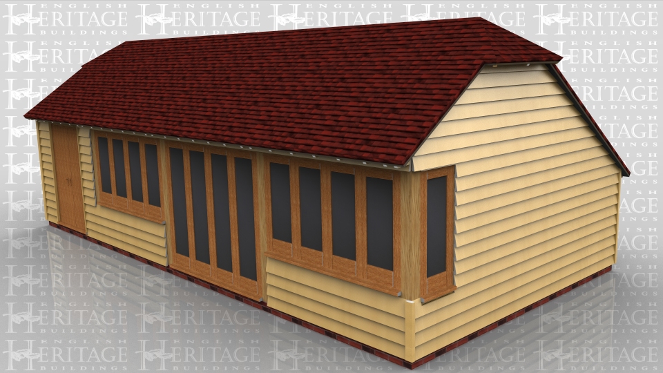 This oak framed home leisure building is formed of four enclosed bays and has a pair of doors for access at the front and full length windows along the front wall. There is also a mullion window to the side.