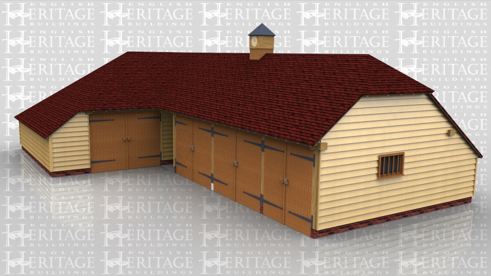 This oak framed garage complex has two buildings, one single bay garage with enclosed log store, and a five bay building with three garage bays and two enclosed storage bays. There is also a clock tower on the right hand building.